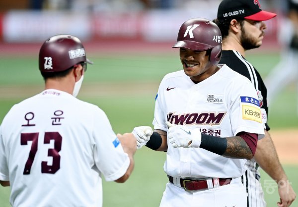3회말 무사 1, 3루에서 키움 러셀이 1타점 역전 적시타를 날린 뒤 오윤 코치의 환영을 받고 있다.