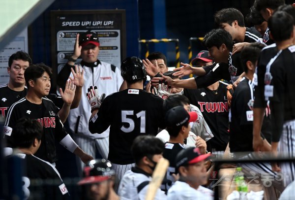 1회초 무사 2, 3루에서 LG 채은성의 희생타 때 득점에 성공한 홍창기가 동료들의 환영을 받고 있다.