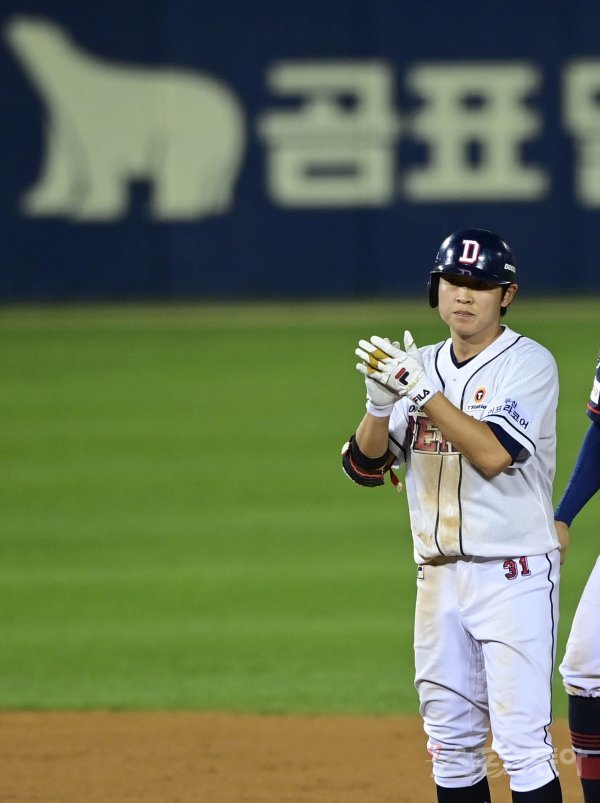 6회말 2사 1, 3루 두산 정수빈이 동점 1타점 우전 2루타를 쳐낸 뒤 박수를 치고 있다.