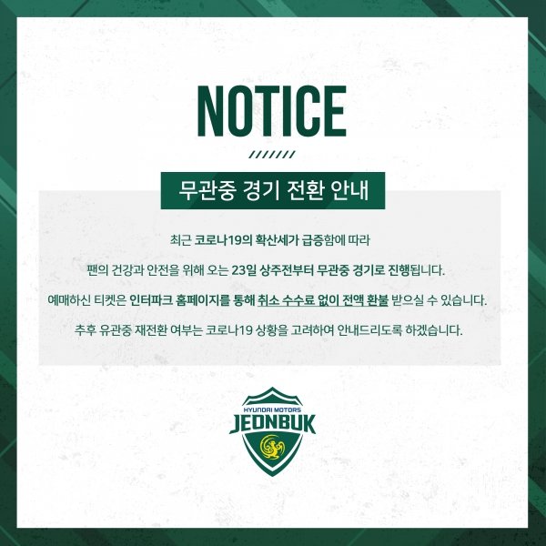 프로축구 K리그1 전북현대모터스축구단이 상주 전 홈경기를 무관중 경기로 전환한다.