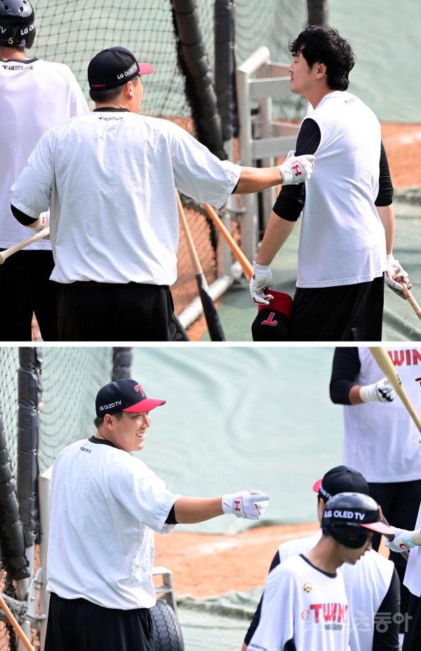 LG 김현수가 이형종에게 장난을 치고 있다.
