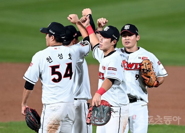 kt가 NC에 8-1로 승리한 뒤 선수들이 그라운드에서 기쁨을 나누고 있다.