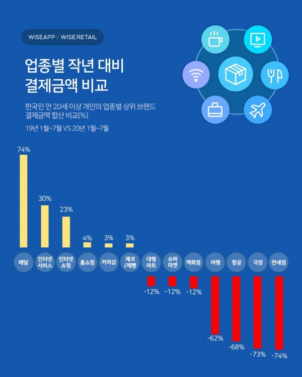 앱·리테일 분석서비스 와이즈앱·와이즈리테일은 올해 1월부터 7월까지 소매시장 업종별 소비자 결제금액을 조사한 결과 이같이 나타났다고 25일 밝혔다. 이번 조사는 만 20세 이상 한국인이 신용·체크카드, 계좌이체, 휴대전화 소액결제로 결제한 금액을 표본 조사해 지난해 같은 기간 결제 금액과 비교하는 방식으로 이뤄졌다.
