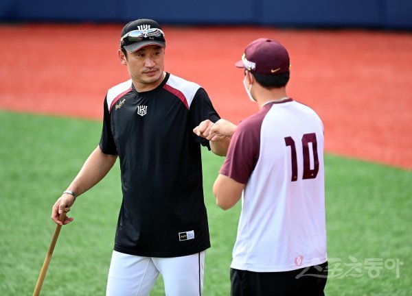 경기 전 kt 박정환 코치가 키움 김웅빈과 인사를 나누고 있다.