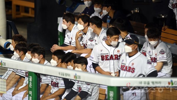 경기 중 더그아웃에서 마스크 의무 착용으로 두산 선수들이 마스크를 쓰고 경기를 바라보고 있다.