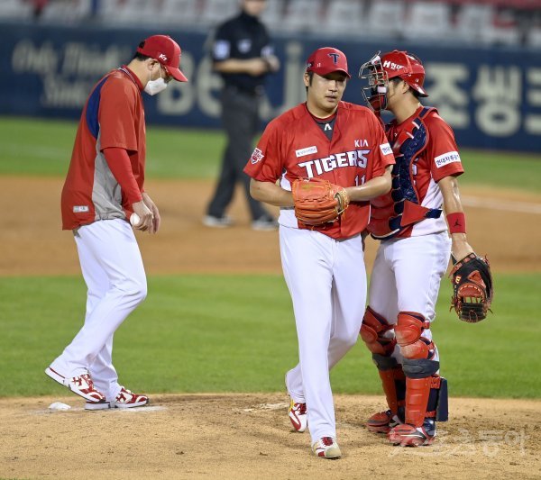 선발 투수로 등판한 KIA 이민우가 5회말 2사 1,3루 상황에서 강판되고 있다.