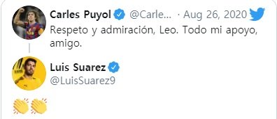 하지만 바르셀로나 레전드 수비수인 푸욜은 메시의 이적 선택을 지지했다. 푸욜은 26일 자신의 SNS에 “존중과 존경, 레오(메시의 애칭) 네 의견을 지지해”라고 적었다. 수아레스는 그 아래 박수를 치는 이모티콘을 달며 동조했다.