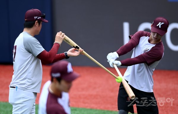 경기 전 키움 김혜성이 강병식 코치의 지도아래 타격 훈련을 하고 있다.