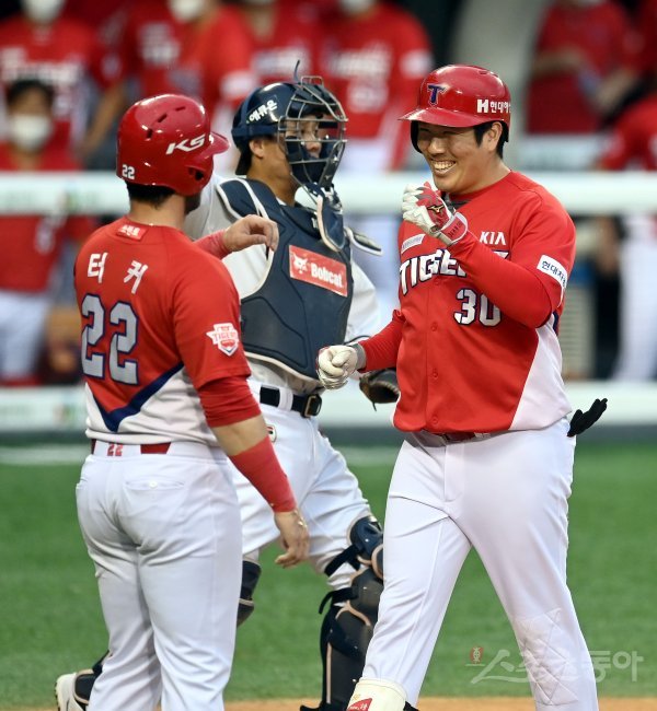 1회초 2사 1,3루 KIA 유민상이 우월 스리런 홈런을 날리고 그라운드를 돌아 홈인해 기뻐하고 있다.