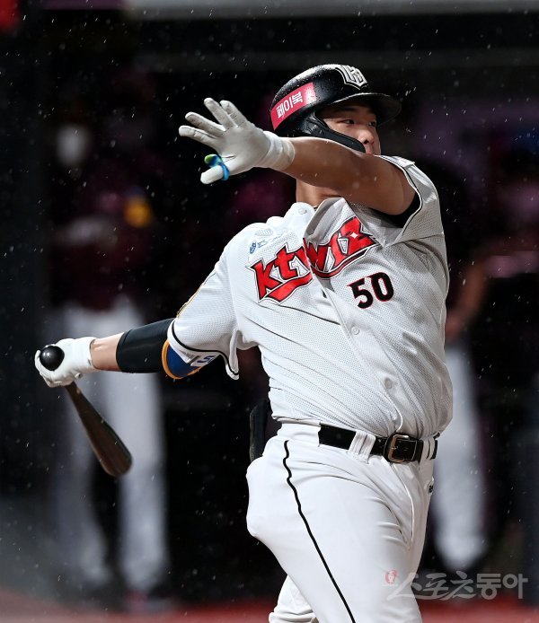 4회말 1사 1루에서 kt 강백호가 2루타를 날리고 있다.