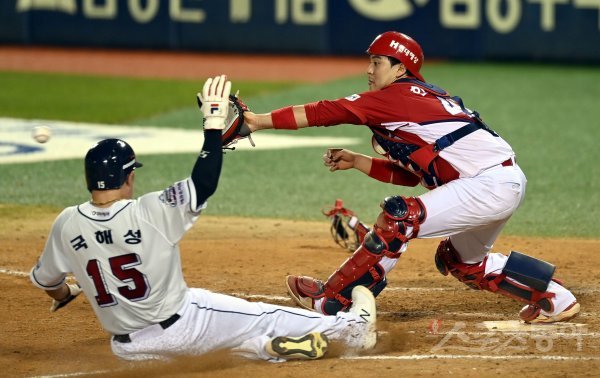 7회말 무사 만루 두산 내야 땅볼 때 KIA 한승택이 3루주자를 포스 아웃시키고 있다.