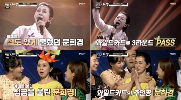 매 라운드마다 과감한 시도와 화려한 퍼포먼스, 원곡을 본인만의 스타일로 재해석해 시청자를 사로잡아 왔던 문희경은 3라운드 역시 역대급 무대를 선보였다. 나훈아의 ‘어매’를 선곡한 문희경은 그녀만의 절절한 감성과 진심을 담아 열창했고 무대를 보는 출연자들과 심사위원, 청중평가단은 물론, 현장의 스태프들까지 압도했다.