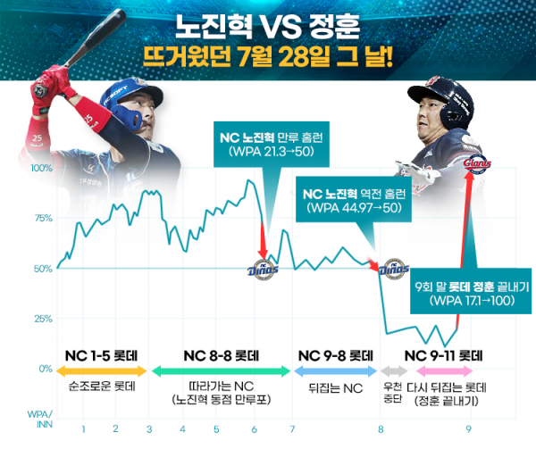 세이버 매트릭스 중에는 WPA(기대 승리 확률 변화)라는 기록이 있다. 기대 승리 확률이 크게 변화하는 경기일수록 극적인 경기였다는 이야기다. WPA 변화를 통해 어떤 경기가 가장 극적인 경기였는지 알아보자.