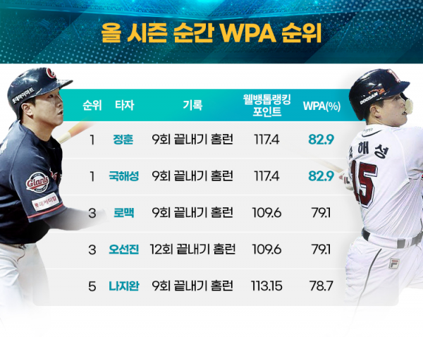 정훈이 타석에 들어서기 전 롯데의 승리 확률은 17.1%에 불과했다. 하지만 정훈은 극적인 끝내기 홈런으로 팀에 승리를 안겼고, 이 장면은 무려 82.9%의 승리 확률 변화를 가져왔다. 또한 정훈은 끝내기 홈런 상황에서 무려 117.4점의 웰뱅톱랭킹 포인트를 기록했다. 이는 한 경기가 아닌 한 가지 상황에서 나온 이번 시즌 최고 점수다.