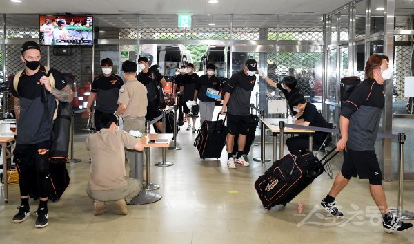 경기 전 마스크를 착용한 한화 선수들이 발열체크를 받고 있다.