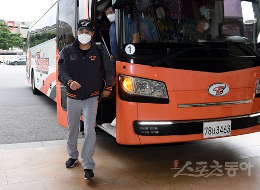 1일 서울 잠실야구장에서 ‘2020 신한은행 SOL KBO리그‘ 두산 베어스와 한화 이글스의 경기가 열린다. 경기 전 한화 최원호 감독대행이 구단 버스에서 내려 야구장으로 향하고 있다. 한화 신정락은 지난 8월 31일 코로나19 확진 판정을 받았다. 잠실|김민성 기자 marineboy@donga.com