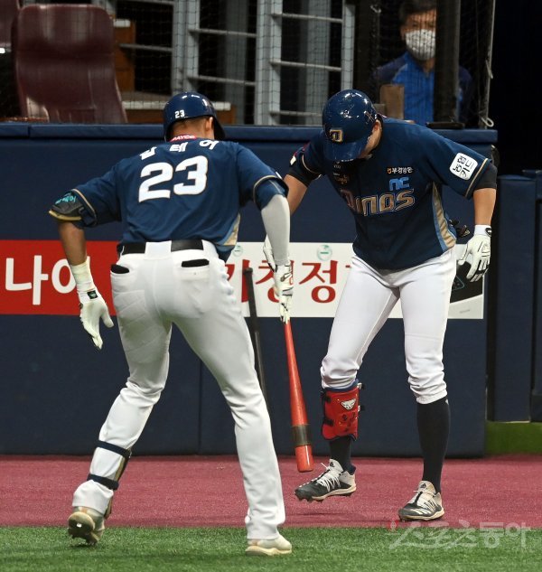 3회초 무사 1루 NC 알테어가 중월 투런 홈런을 날리고 그라운드를 돌아 홈인해 세리머니를 하고 있다.