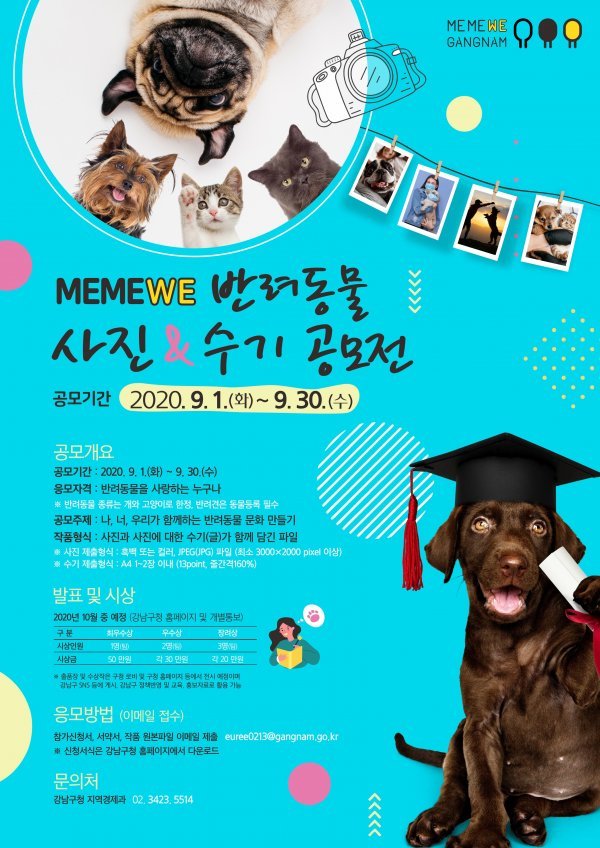 ‘기분 좋은 변화, 품격 있는 강남’을 실현 중인 강남구(구청장 정순균)는 이달 1일부터 반려동물을 주제로 한 ‘MEMEWE 반려동물 사진·수기 공모전’을 개최한다고 밝혔다.