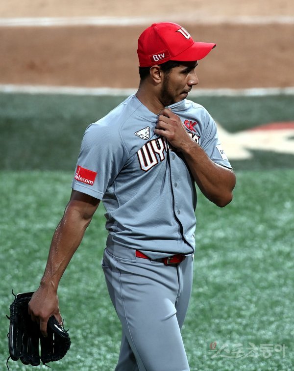 1회 kt 공격 때 4실점을 허용한 SK 선발 핀토가 이닝 종료 후 더그아웃으로 향하고 있다.