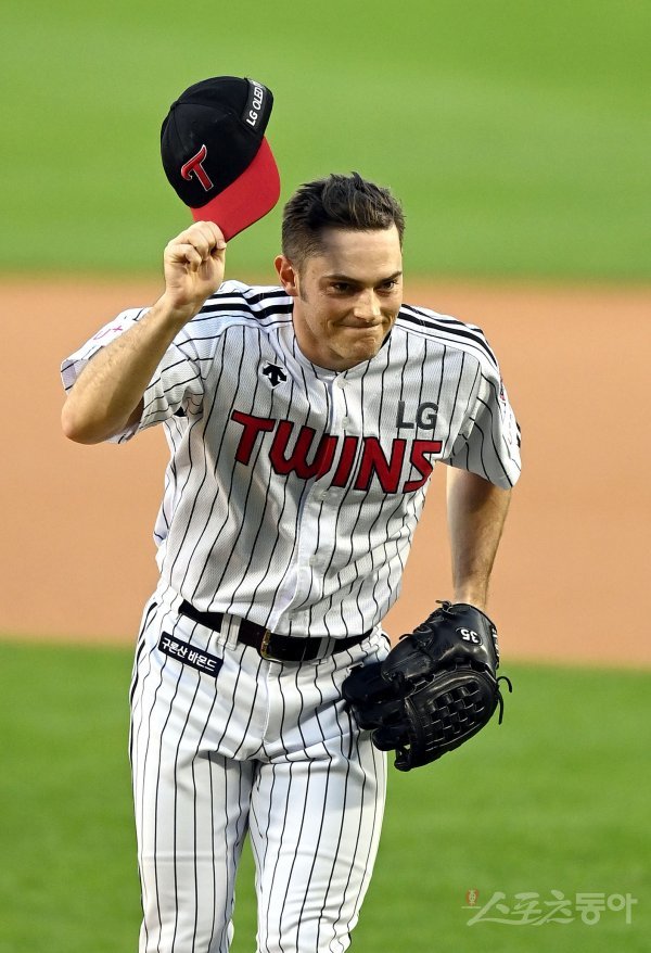 선발 투수로 등판한 LG 윌슨이 인사를 하고 있다.