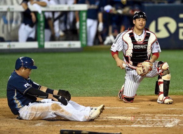 7회초 2사 2루 NC 안타 때 LG 유강남이 NC 2루주자 양의지를 태그 아웃시킨 후 웃고 있다.