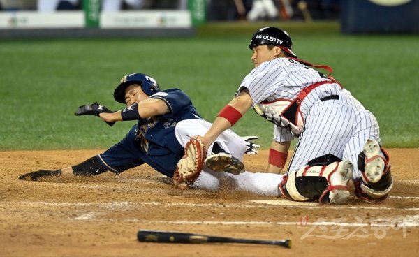 7회초 2사 2루 NC 안타 때 2루주자 양의지가 홈까지 달렸으나 아웃되고 있다.
