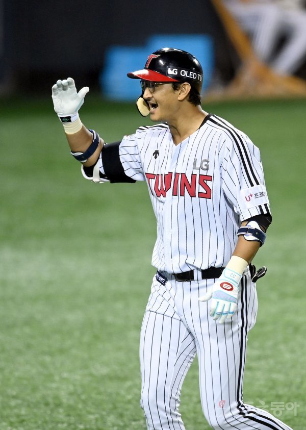 8회말 2사 1,3루 LG 박용택이 역전 우월 스리런 홈런을 날린 후 그라운드를 돌아 홈인해 기뻐하고 있다.