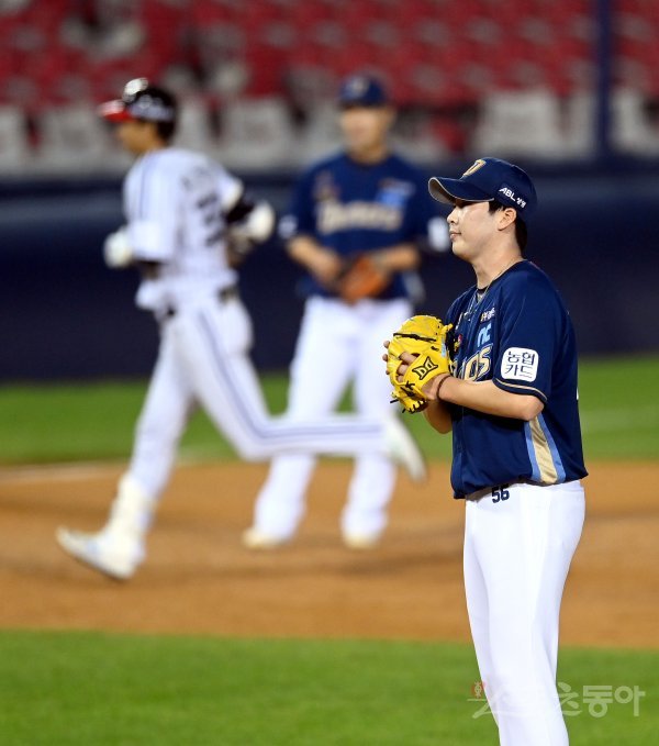 NC 문경찬이 8회말 2사 1,3루 LG 박용택에게 역전 우월 스리런 홈런을 허용한 후 아쉬워하고 있다.