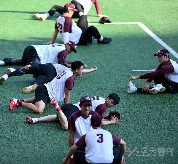 경기 전 키움 선수들이 스트레칭 훈련을 하고 있다.