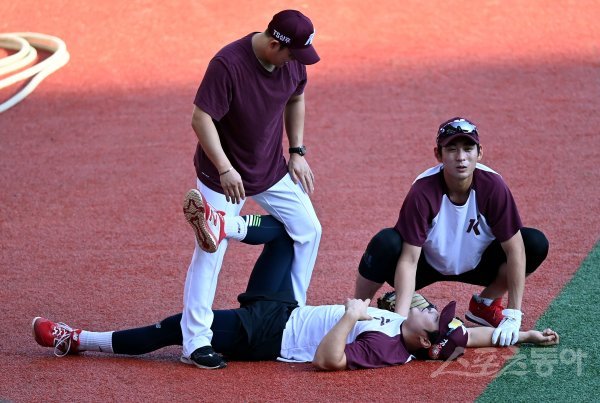 경기 전 키움 이정후가 김하성의 스트레칭을 돕고 있다.