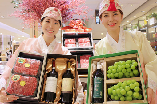 협업 상품도 인기다. 롯데백화점은 와인에 각각 횡성한우와 샤인머스캣을 함께 구성한 협업 세트를 내놓았다. 현대백화점은 한우에 송로버섯 소금·치즈크림소스 등 한우와 곁들여 먹을 수 있는 고급 식료품을 함께 구성한 ‘넘버나인 프리미엄 세트’를 선보였다. 또 사과와 배 등 전통 제수용 과일에 제주산 왕망고와 샤인머스캣 등 이색 과일을 더한 상품, 쌀과 멜론을 함께 섞은 ‘현대쌀집 멜론 세트’, 전남 완도산 전복·소라·가리비를 함께 구성한 ‘완도 활패류 세트’ 등을 준비했다. 윤상경 현대백화점 신선식품팀장은 “고객의 다양한 취향을 만족시키기 위해 프리미엄급 상품을 함께 넣은 콜라보 선물세트를 준비했다”고 했다.