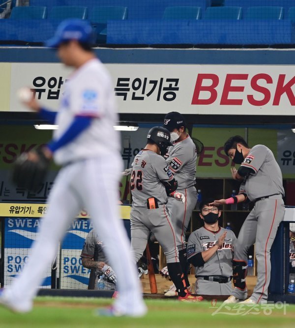 7회초 1사 3루 한화 노수광이 동점 1타점 희생플라이를 쳐낸 뒤 더그아웃에서 동료들의 축하를 받고 있다.