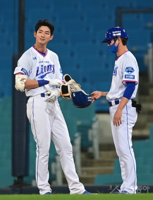 삼성 구자욱이 7회말 2사 1, 3루 상황에서 삼진 아웃당한 뒤 장비를 정리하며 아쉬워하고 있다.