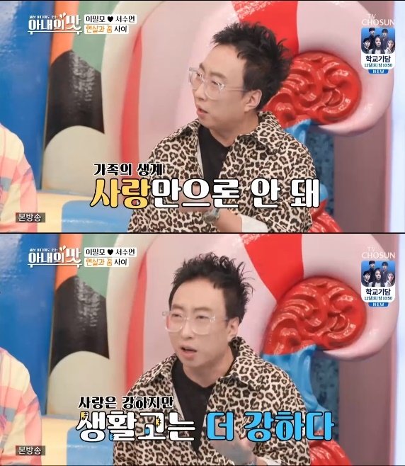 그러자 박명수는 “내가 한 마디 하겠다. 사랑은 모든 걸 이길 수 있지만 생활고는 못 이긴다. 600만 원 벌다 200만 원으로 내려가면 굉장히 큰 고통이다. 자녀가 있는 경우 더한다. 무시할 수 없다”는 소신을 밝혔다.