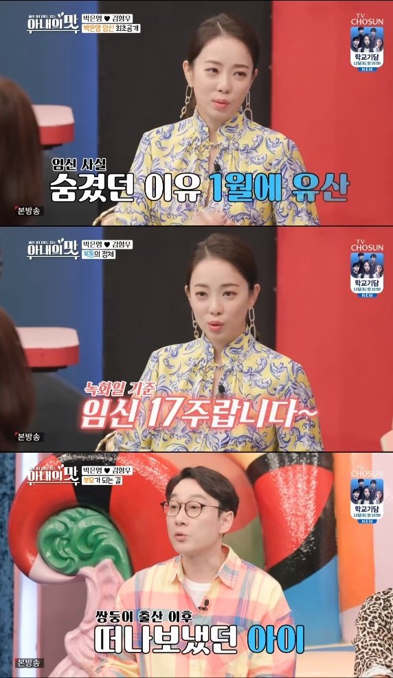 알고 보니 박은영은 임신 증세로 입덧과 복통을 호소한 것. 그는 “녹화일 기준으로 17주다. 공개를 못했던 게 1월에 유산을 했다. 퇴사를 했던 게 불규칙한 호르몬 때문이었다. 하혈도 했다”고 털어놨다.