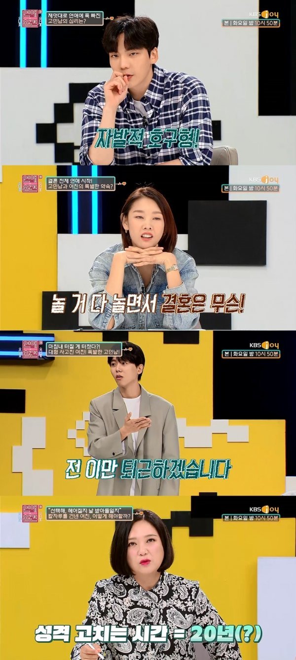 마지막으로 김숙은 "보통 성격 고치는 데 20년은 걸린다고 본다. 자신과 맞지 않다고 생각하면 빨리 헤어져야 한다. 여친은 본인이 원하는 대로 절대 바뀌지 않을 것"이라며 회의적인 반응을 보였다.