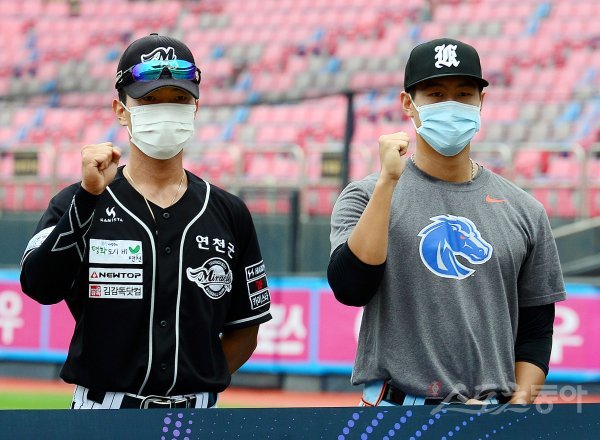 9일 경기도 수원 kt위즈파크에서 ‘2021 신인 드래프트 트라이아웃’이 열렸다. 트라이아웃에 참가한 심종원과 김건형이 카메라를 향해 포즈를 취하고 있다.