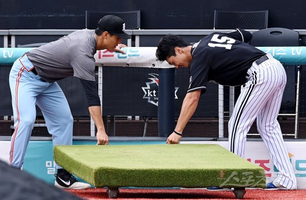 9일 경기도 수원 kt위즈파크에서 ‘2021 신인 드래프트 트라이아웃’이 열렸다. 트라이아웃 참가한 김건형과 심종원이 타격을 마친 뒤 장비들을 정리하고 있다.
