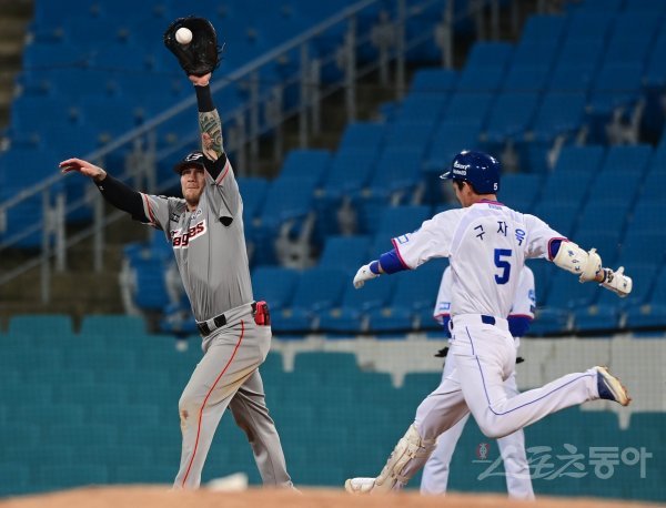 9일 대구 삼성라이온즈파크에서 ‘2020 신한은행 SOL KBO리그’ 삼성 라이온즈와 한화 이글스의 더블헤더 2차전 경기가 열렸다. 한화 반즈가 4회말 무사 삼성 구자욱의 내야 땅볼 때 1루에서 송구를 잡고 있다.