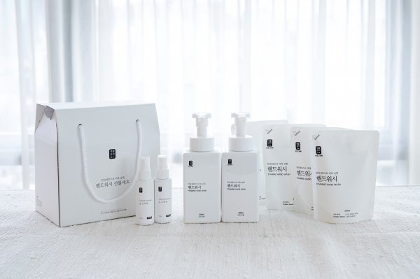 ‘안심성분으로 더욱 순한 핸드워시’(500ml) 2개 및 리필용(200ml) 4개, ‘칙칙할 때 칙칙하세요. 손소독제’ 2개로 구성했다.