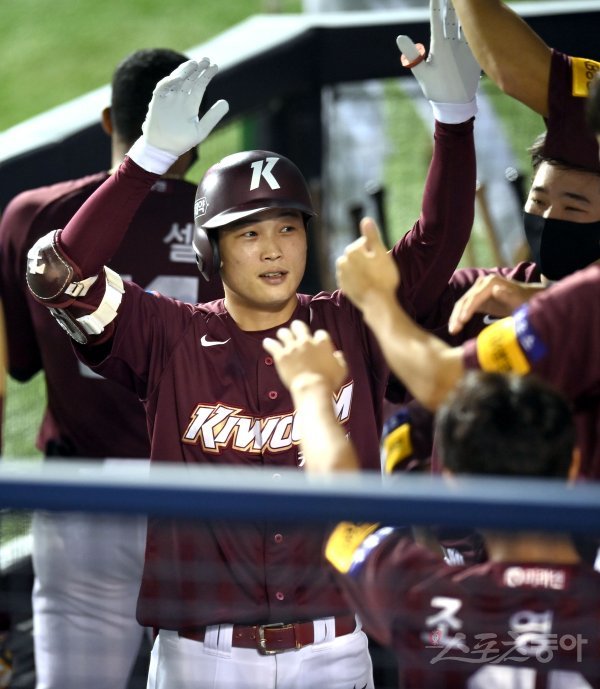 10일 서울 잠실야구장에서 ‘2020 신한은행 SOL KBO 리그’ 키움 히어로즈와 LG 트윈스 경기가 열렸다. 3회초 2사 키움 박준태가 우월 솔로를 날리고 그라운드를 돌아 홈인해 하이파이브 하고 있다.
