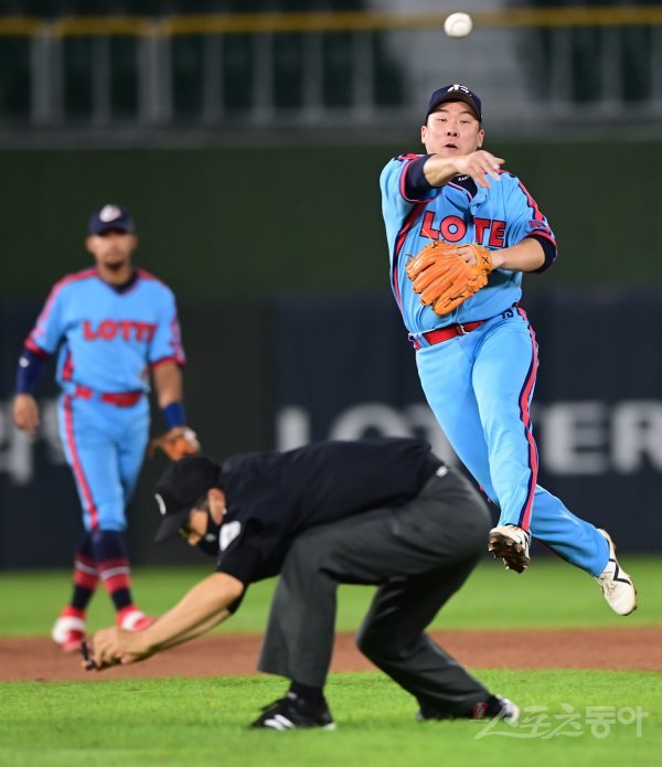 10일 부산 사직야구장에서 ‘2020 신한은행 SOL KBO리그’ 롯데 자이언츠와 삼성 라이온즈의 경기가 열렸다. 롯데 2루수 안치홍이 7회초 1사 2루 삼성 김동엽의 내야 땅볼을 잡아 1루로 송구하고 있다.