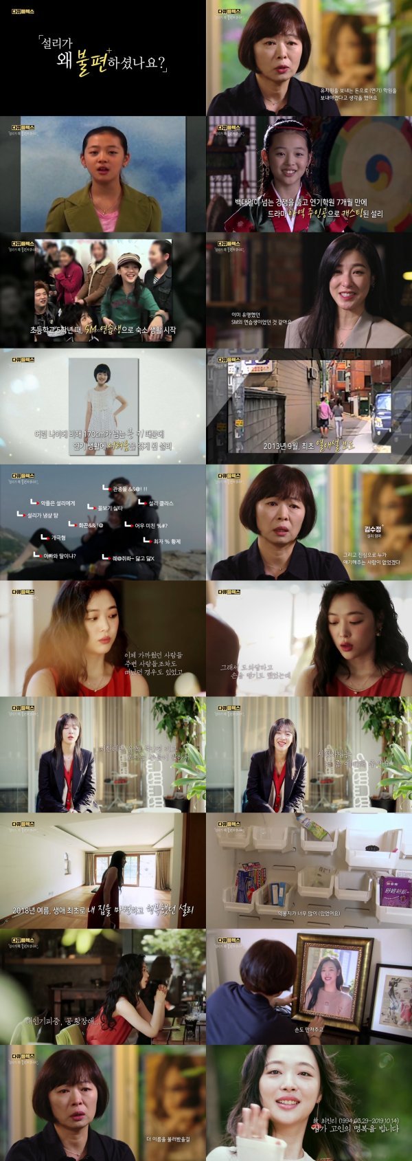 처음으로 방송에 모습을 보인 설리 엄마 김수정씨는 설리의 어린 시절부터 데뷔 이후 그리고 설리의 마지막 모습까지를 추억했다. 경제적으로 넉넉하지 않아 유치원 대신 연기학원을 보냈다는 엄마, 설리는 방송을 통해 공개된 당시 영상에서 나이에 맞지 않게 동백아가씨를 구슬프게 불러 시청자들의 눈길을 끌었다. 설리는 이후 오디션을 통해 드라마 서동요의 선화공주 아역에 발탁된다. 서동요를 연출한 이병훈 감독은 “(설리가) 당당하고, 밝고, 얼굴 전체가 공주처럼 화려하고 그랬다”며 설리를 회상했다.