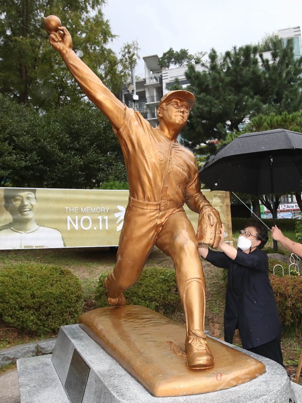 고 최동원 선수의 모친 김정자 여사가 부산 사직야구장 광장에 위치한 최동원 동상 앞에서 ‘고(故) 최동원 9주기 추모행사’에 참석해 동상을 쓰다듬고 있다.