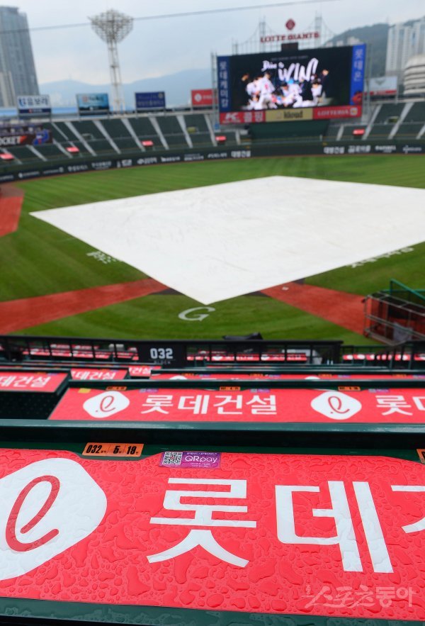 11일 부산 사직야구장에서 ‘2020 신한은행 SOL KBO리그’ 롯데 자이언츠와 삼성 라이온즈의 경기가 열린다. 경기에 앞서 그라운드에 비가 내리며 방수포가 덮여있다.