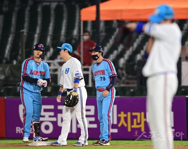 11일 부산 사직야구장에서 ‘2020 신한은행 SOL KBO리그’ 롯데 자이언츠와 삼성 라이온즈의 경기가 열렸다. 4회말 무사 만루 롯데 민병헌이 역전 2타점 우전 적시타를 쳐낸 뒤 보호 장비를 정리하고 있다.