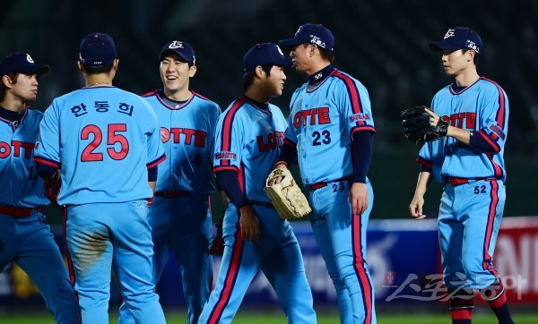 11일 부산 사직야구장에서 ‘2020 신한은행 SOL KBO리그’ 롯데 자이언츠와 삼성 라이온즈의 경기가 열렸다. 롯데가 삼성에 12-4로 승리를 거둔 뒤 선수들이 기쁨을 나누고 있다.