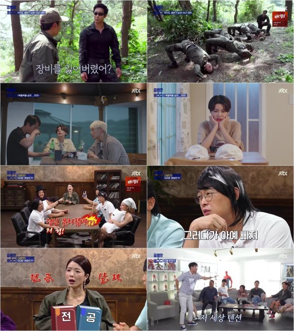 이어 숙소 만들기에 돌입한 멤버들. 이때 이근 대위에게 1대 1 교육을 받게 된 이세진은 하나뿐인 장비, 칼을 분실하는가 하면, 서태훈, 임우일은 손으로 건들기만 해도 무너지는 숙소를 만들어 이근 대위를 분노케 했다. 이처럼 총체적 난국인 멤버들의 모습에 이근 대위는 “딱 봐도 개판이죠?”라며 배 튀기기를 지시, 단체 기합을 받는 멤버들의 모습이 안습을 유발했다. 이에 임우일은 살면서 가장 힘든 순간은 “지금”이라고 밝히기도. 무엇보다 말미 장기자랑으로 만회할 시간을 주는 이근 대위와, 당혹감을 감추지 못하는 멤버들의 모습이 담긴 바. 이들의 생존 훈련기가 어떻게 이어질지 관심이 고조된다.