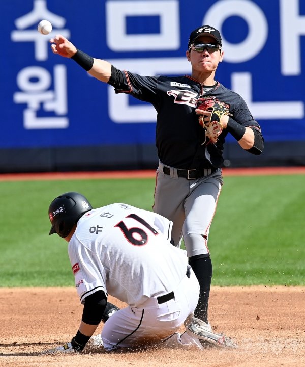13일 경기도 수원 kt위즈파크에서 ‘2020 신한은행 SOL KBO리그’ kt 위즈와 한화 이글스의 경기가 열렸다. 2회말 무사 1, 2루에서 kt 박경수의 내야 땅볼 때 한화 강경학이 1루 주자 유한준을 2루에서 포스 아웃시킨 뒤 1루로 송구하고 있다.