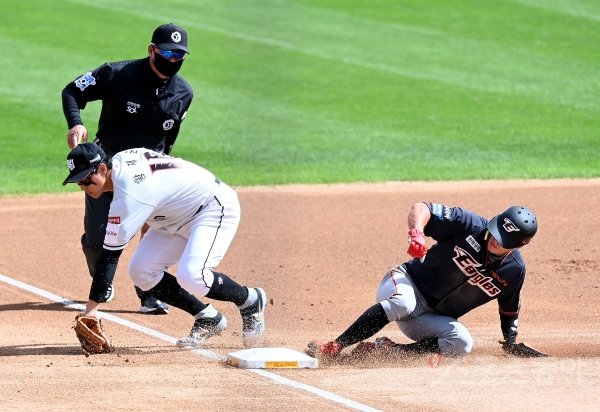 13일 경기도 수원 kt위즈파크에서 ‘2020 신한은행 SOL KBO리그’ kt 위즈와 한화 이글스의 경기가 열렸다. 1회초 2사 2루에서 한화 반즈 타석 때 2루 주자 노수광이 3루 도루에 성공하고 있다.